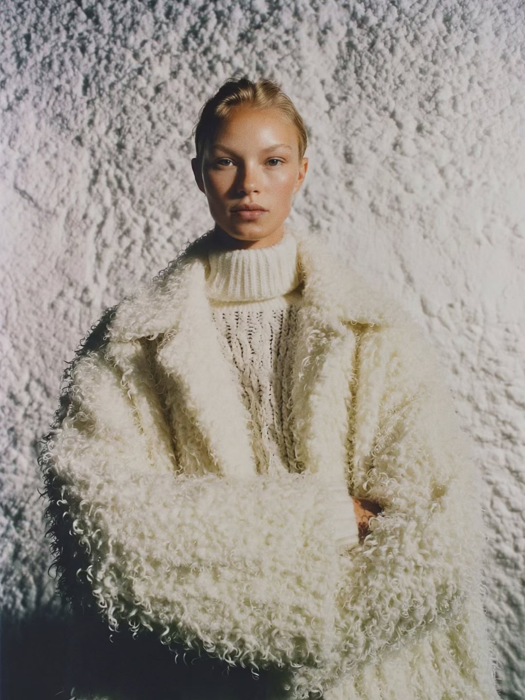 Features: High prominent cheekbones, strong brows, defined jaw, versatile expressive range (from neutral editorial to bright smile)
